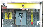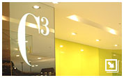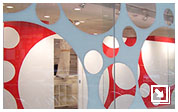 色付き熱線反射フィルムをガラスに貼り付け、ロゴマークを抜き文字。壁面は電飾用マーキングフィルムで装飾。